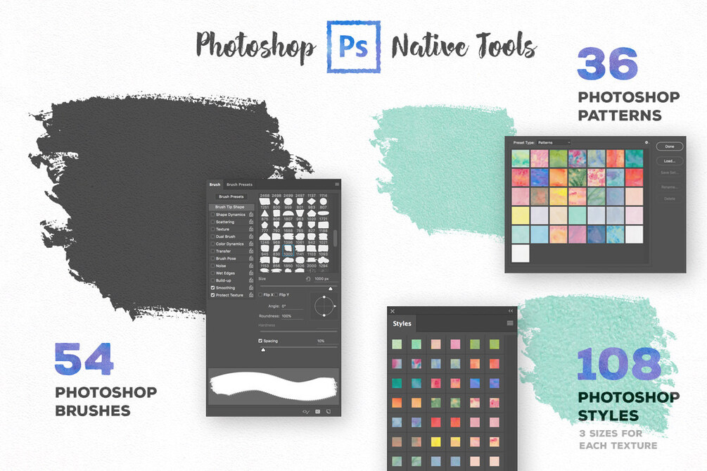It includes brushes, patterns, layer styles, and symbols to make your workflow comfortable with your favorite app, Adobe Photoshop or Illustrator. Of course, source assets are included as well, in all popular formats including PNG files. Also, you will get 150+ beautiful hand-drawn vector illustrations that will help you to unleash your creative potential as a nice bonus.
