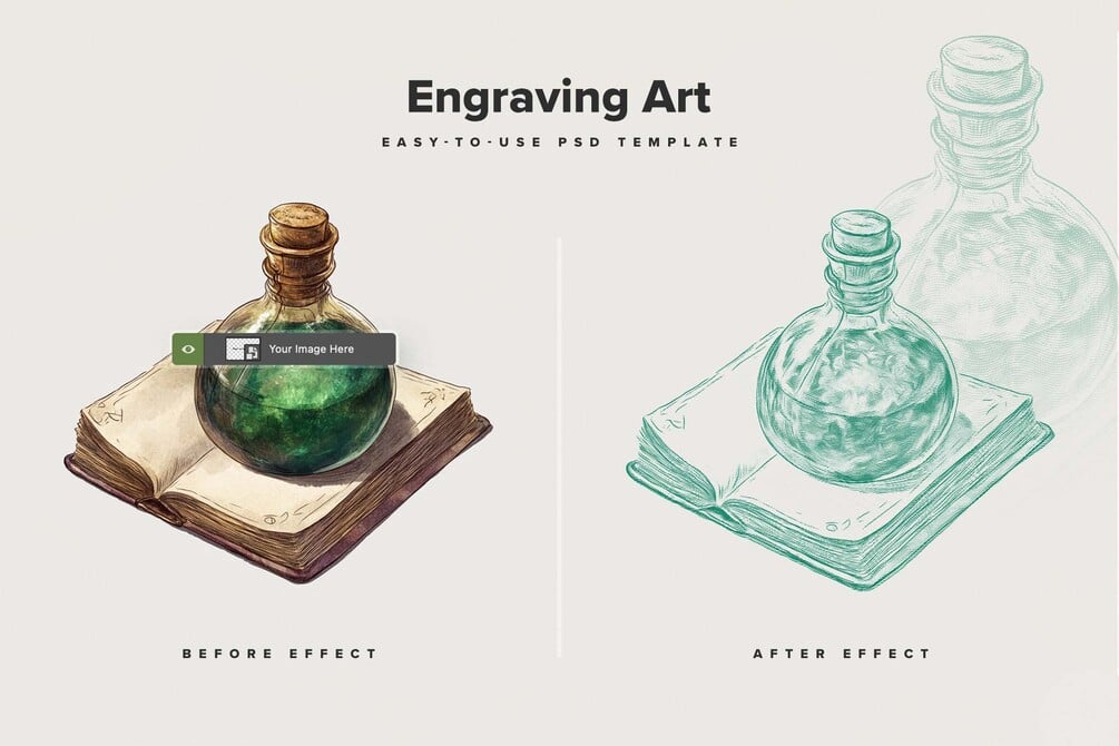 Our new Engraving Photo Effect for Photoshop is a carefully crafted PSD template that delivers a clean, precise engraving effect with an authentic hand-drawn aesthetic. This tool transforms photos and illustrations into highly detailed, engraved artwork, making it perfect for various creative projects, from vintage book illustrations to modern marketing designs.
