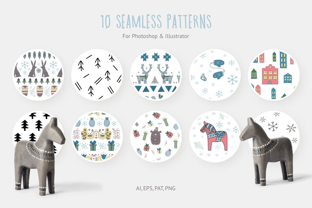 Scandinavian design and folk style were always an endless source of inspiration for me! All I want sometimes is to spend all winter holidays in some magic village from a folk fairy tale. So, I hope my new Christmas vector pack will bring this magic feeling to you, and inspire to create something beautiful and make the most wonderful time of the year even better!